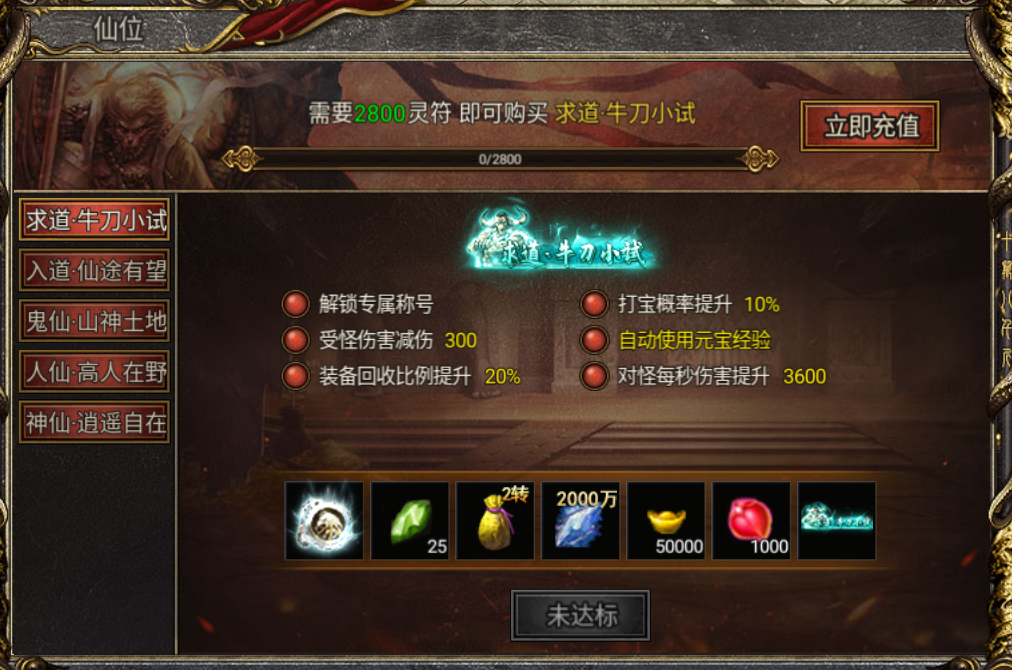 - 起步建议:平民玩家进入游戏后建议首充,再买一个求道牛刀小试特权! 30元全搞定。